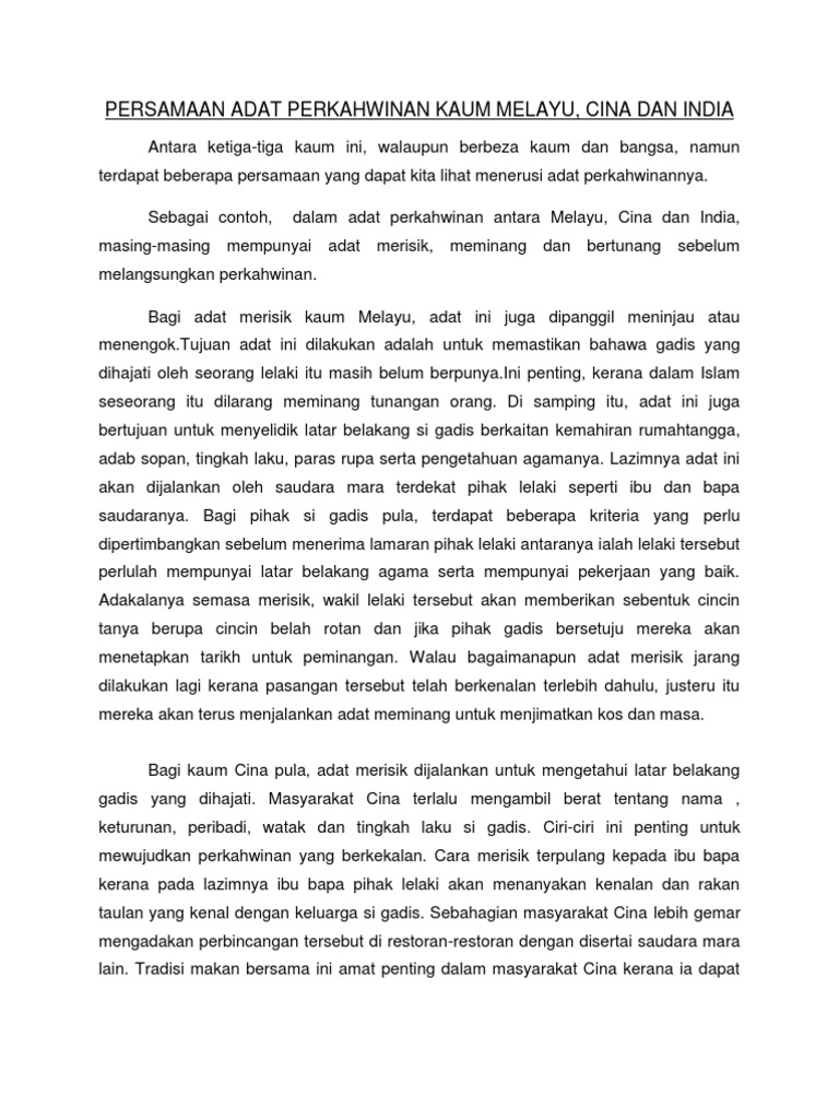 Pengajian malaysia jabatan perdagangan program : Adat perkahwinan melayu merupakan adat resam yang menjadi tunjang bermulanya kehidupan sesebuah keluarga. Bagi kaum ini upacara keagamaan adalah akad nikah. Adat istiadat perkahwinan kaum india. Seterusnya, bagi adat meminang dan bertunang pula, dalam kaum melayu, setelah diketahui bahawa gadis tersebut belum berpunya, pihak keluarga lelaki akan. Ragam perkawinan masyarakat adat minangkabau ada 2 (dua), yaitu: Proses upacara perkawinan adat istiadat minangkabau dapat dibuat menjadi suatu urutan sebagai berikut awal dari sebuah perkawinan jika menjadi urusan keluarga, bermula dari penjajakan. Mak andam adalah antara yang penting dalam menghias pengantin dan menyediakan pelamin. Sebagai insan pendukung adat, tradisi dan kebudayaan masyarakat melayu riau sangat mengenal prinsip tahu diri,yang artinya orang melayu senantiasa berpegang pada ungkapan man 'arafa nafsahu fa qod 'arafa rabbahu bermakna siapa mengenal dirinya kenallah dia dengan tuhannya. Ikatan hidup bersama antara seorang pria dan wanita, yang bersifat komunal dengan tujuan mendapatkan generasi penerus agar supaya kehidupan persekutuan atau clannya tidak punah, yang didahului dengan rangkaian upacara adat. Pertama, baju melayu cekak musang yang terdiri dari celana, kain dan songkok. Gagasan, terapan, fungsi, dan kearifannya/ muhammad takari et al. pada saat rasulullah muhammad saw ditawarkan pemerintahan, harta, dan wanita oleh kaum quraisy, agar nabi meninggalkan tugas yang diembankan allah kepadanya yaitu menyiarkan agama. Bagi adat merisik kaum melayu, adat ini juga dipanggil meninjau atau.