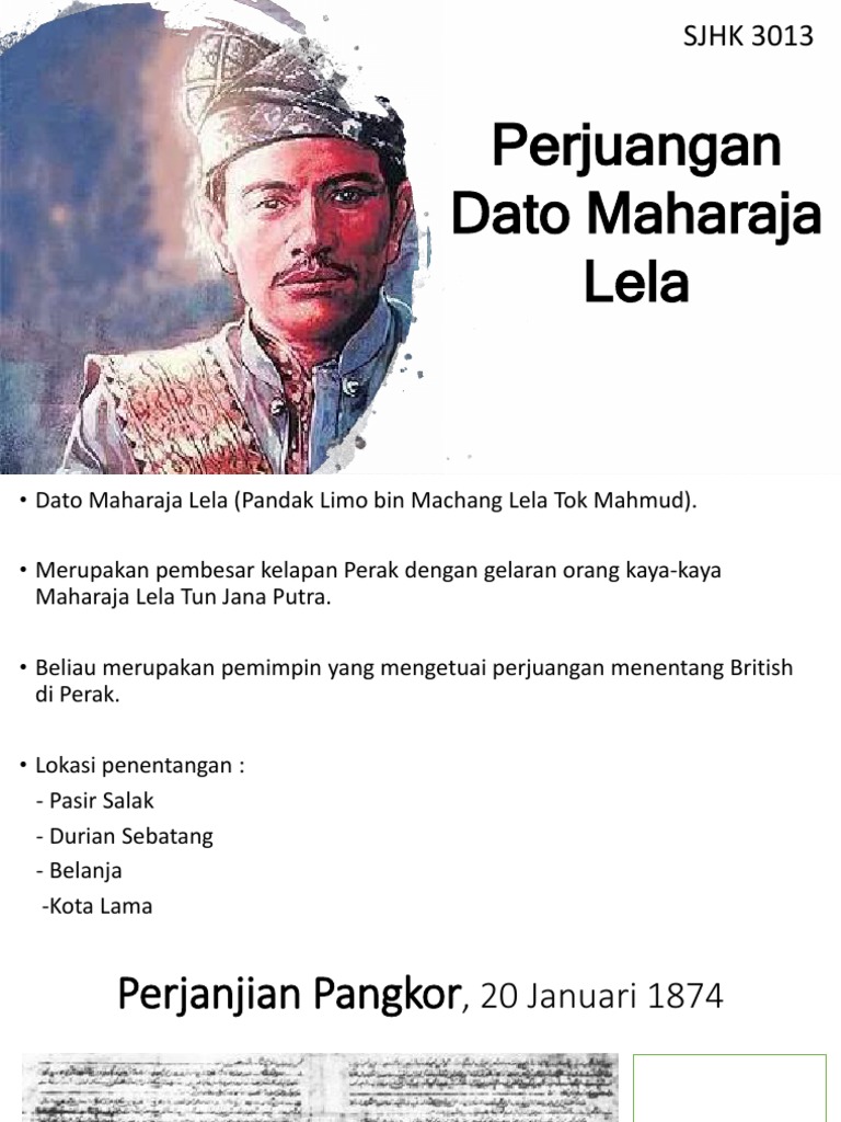 Daeng salili dating ke perak ketika pemerintahan sultan muzaffar shah iii. 20 januari 1877) ialah seorang pembesar kelapan perak yang merupakan pejuang bangsa yang bertanggungjawab kepada sumpah dan janjinya tetapi dikecewakan oleh raja dan bangsanya sendiri. Dato seri maharaja lela haji abd. Consequences paid by dato maharajalela. Beliau tidak mahu mengotorkan dirinya menjadi pencacai british, sebaliknya dengan penuh strategi dan umpamanya mempertahankan sistem tradisional di perak yang.